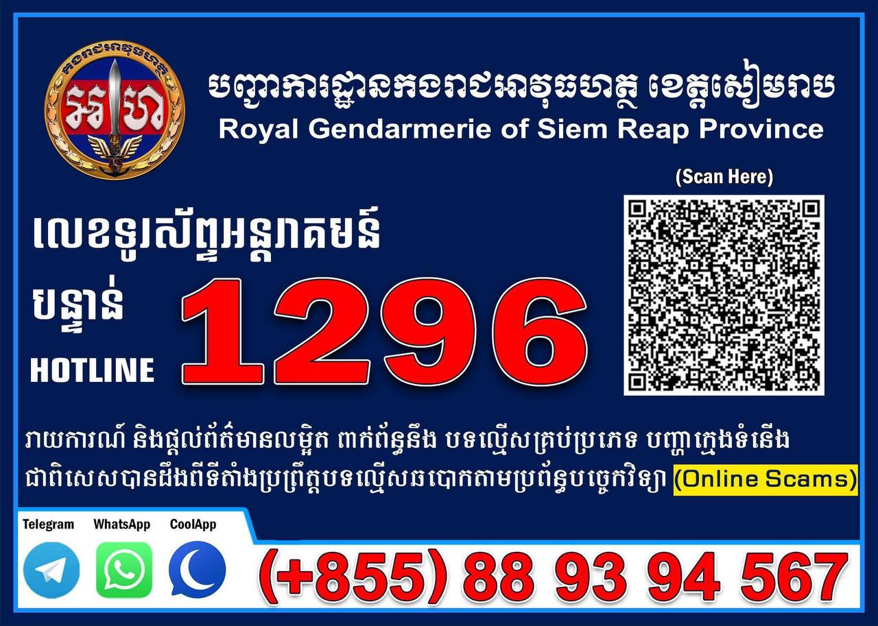 កងរាជអាវុធហត្ថខេត្តសៀមរាប សូមជម្រាបជូនបងប្អូនប្រជាពលរដ្ឋ ក្នុងខេត្តសៀមរាប ឲ្យបានជ្រាបថា ៖ បើសិនជាបងប្អូនប្រជាពលរដ្ឋ បានជួបហេតុការណ៍បន្ទាន់ត្រូវការអន្តរាគមន៍ពាក់ព័ន្ធនឹង បទល្មើសគ្រប់ប្រភេទ បញ្ហាក្មេងទំនើង ដែលបង្កការគំរាមកំហែង និងអសន្តិសុខ ដល់ប្រជាពលរដ្ឋ និងសង្គម ជាពិសេសបានដឹងពីទីតាំងប្រព្រឹត្តបទល្មើសឆបោកតាមប្រព័ន្ធបច្ចេកវិទ្យា (Online Scams) សូមបងប្អូនហៅទូរស័ព្ទមកកាន់លេខ (Hotline) 1296 (ដោយឥតគិតថ្លៃ 24/24ម៉ោង)ឬ អាចទាក់ទងមកតាមបណ្តាញ Telegram, WhatsApp, CoolApp របស់កងរាជអាវុធហត្ថខេត្តសៀមរាប តាមរយៈលេខ 088 93 94 567 របស់កងរាជអាវុធហត្ថខេត្តសៀមរាប ដើម្បីចាត់វិធានការចុះបង្ក្រាបឱ្យបានទាន់ពេលវេលា ហើយ អាវុធហត្ថខេត្តសៀមរាប នឹងរក្សាការសម្ងាត់ជូនផងដែរ។